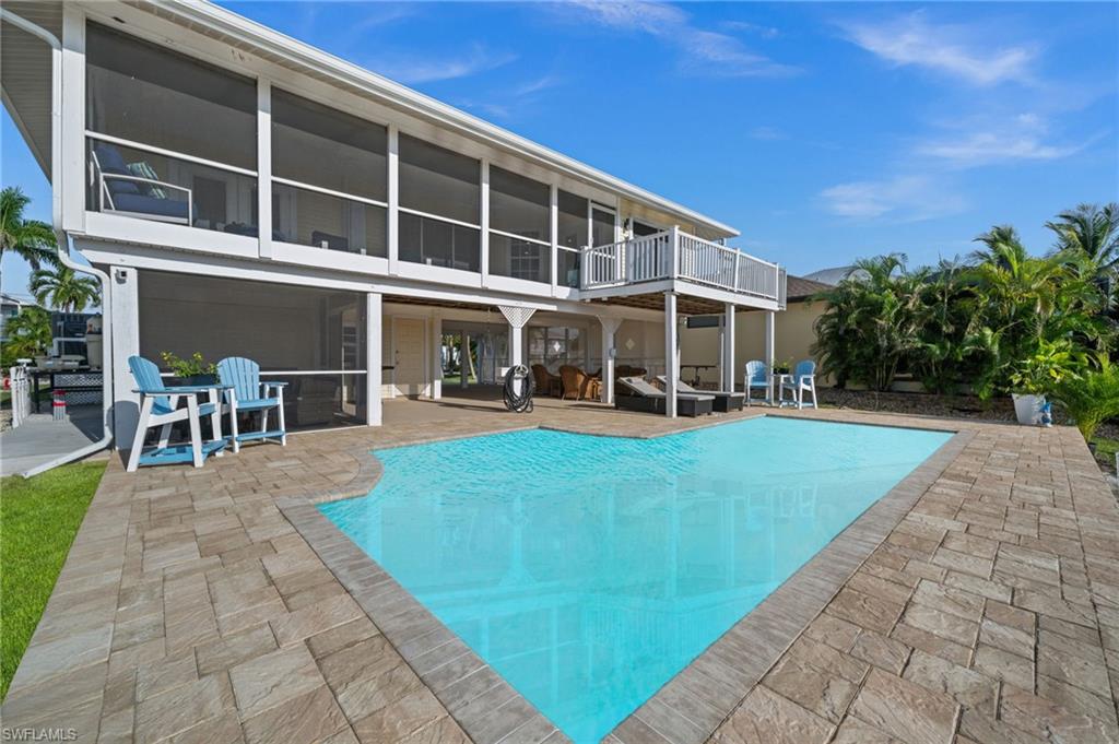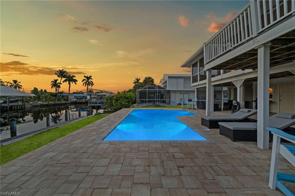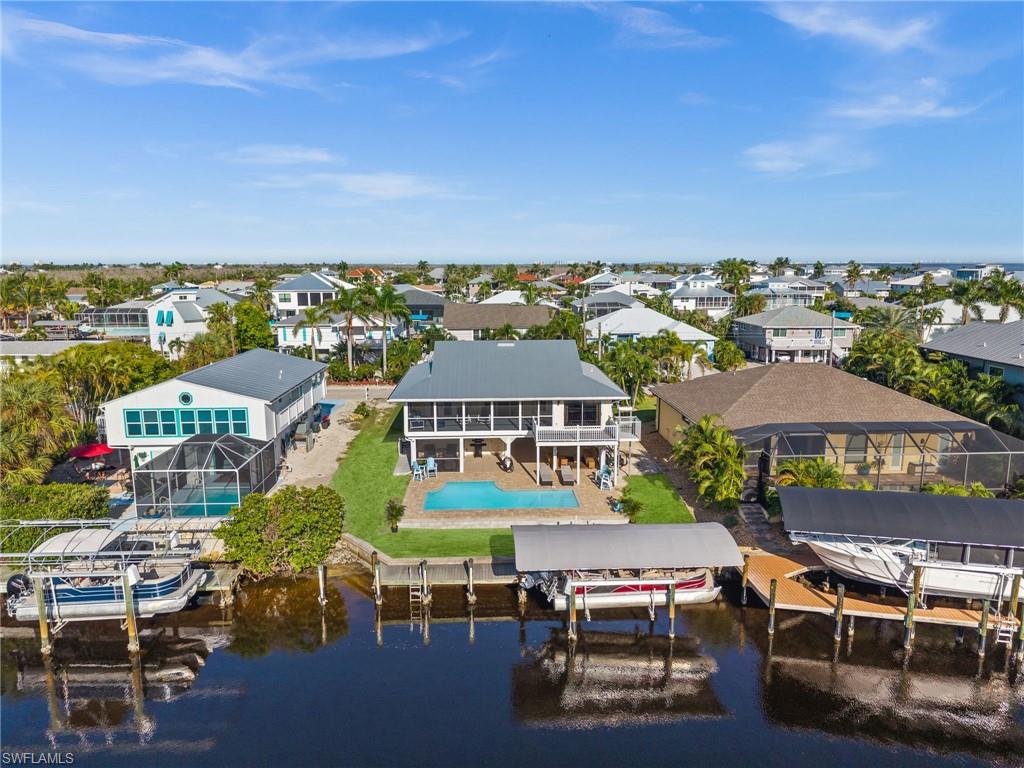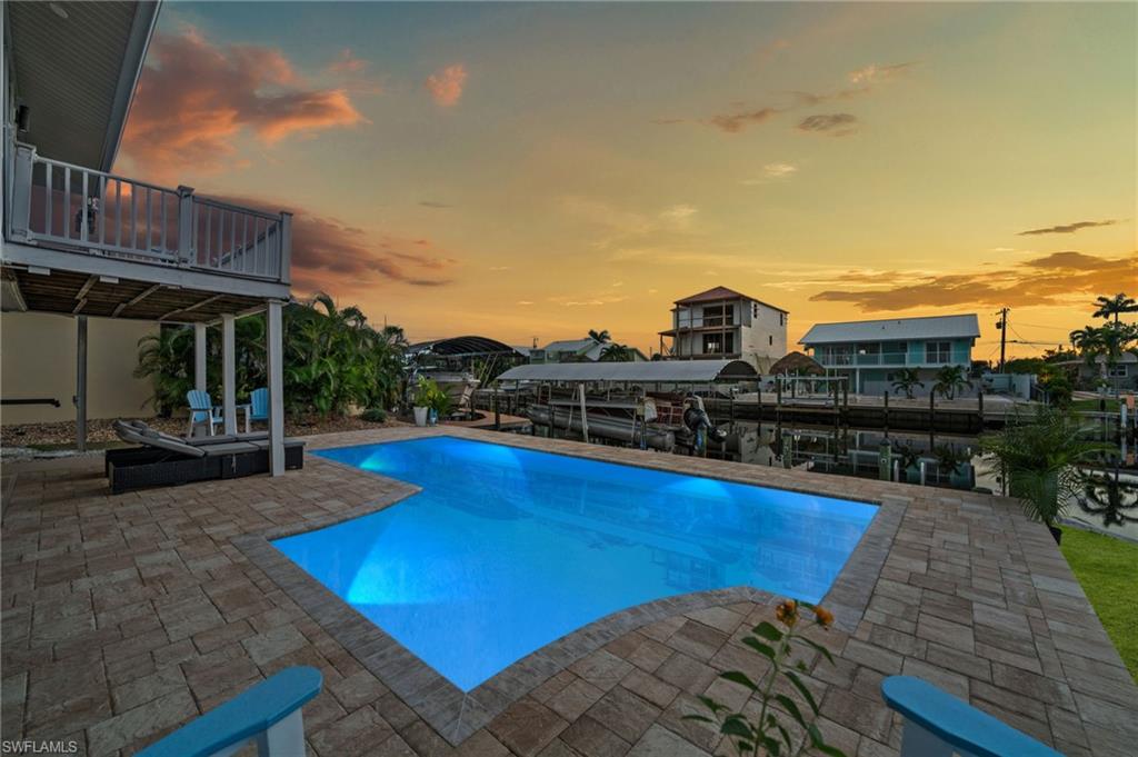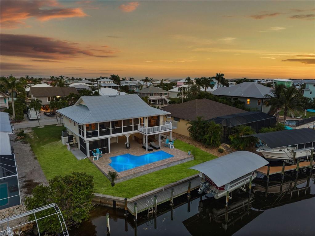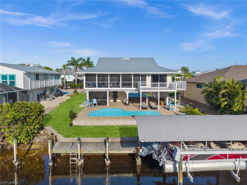 Whimsical Island Living in St. James City! Dive into your own paradise with a brand-new custom poolu2014complete with a sun shelf, LED bubblers, glow lighting, and a saltwater system. Add direct Gulf access and an 8K boat lift with canopy and composite captainu2019s walk dock, and adventure by water is just minutes away. From your dock, itu2019s a quick ride to the open bayfront and the sandy beaches of Sanibel, Captiva, Cayo Costa, and Boca Grande, along with the world-famous fishing grounds of Pine Island Sound. Fresh landscaping enhances the tropical curb appeal, while inside, vaulted ceilings and abundant natural light create an airy, open feeling. Despite its cozy island footprint, each bedroom easily fits a king-size bed, offering a comfortable and well-designed layout. The 2024 remodeled kitchen shines with quartz countertops, white raised-panel cabinets, a center island, and stainless-steel appliances. Sliders from the great room open to a spacious screened lanai, while an open-air balcony off the kitchen is perfect for morning coffee or sunset cocktails. The primary suite is a private retreat with lanai access, two closets (including a walk-in), and a spa-like bath. Guests enjoy their own wing with a pocket slider for added privacy. Nearly every room whispers water views, reminding you that the Gulf is never far. On the lower level, a second screened lanai, shaded gathering space, and two flexible storage rooms offer room to expandu2014perfect for an outdoor kitchen, game area, workshop, or guest hideaway. Thereu2019s also covered parking below with plenty of space for your golf cartu2014essential for exploring the golf cartu2013friendly streets of St. James City. With updates including a new roof (2023), Pergo flooring, and reinforced seawall, this home combines peace of mind with the ultimate in waterfront fun. From sun-up to sun-down, this home blends updates, whimsy, and island charmu2014a tropical retreat made for living.